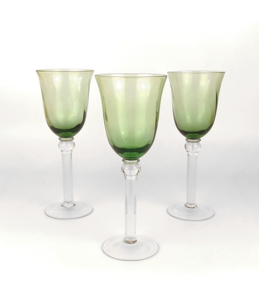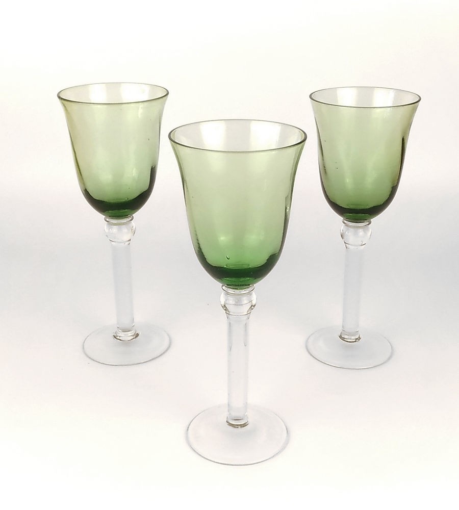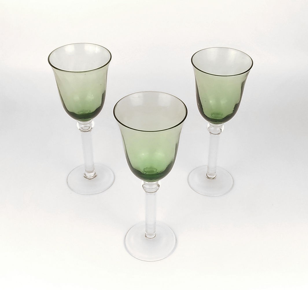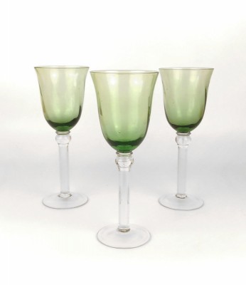 3 TAÇAS DE VINHO TINTO EM VIDRO VERDE, PÉS TRANSPARENTES. ALT 22CM. PERFEITO ESTADO.
