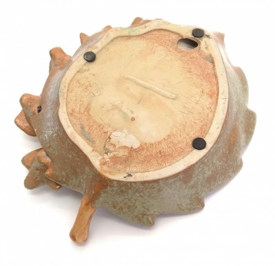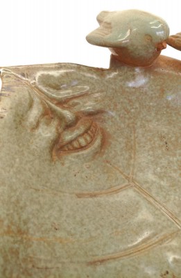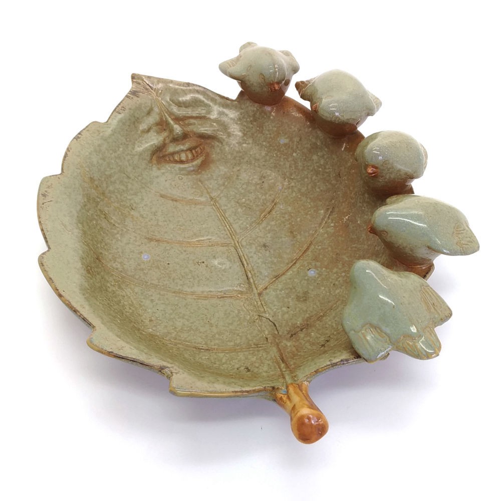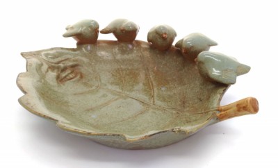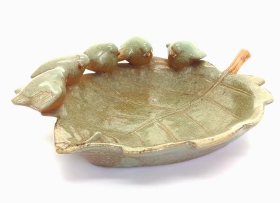 PETISQUEIRA EM CERÂMICA VERDE - FOLHA COM PÁSSAROS. 20X24CM. PERFEITO ESTADO.